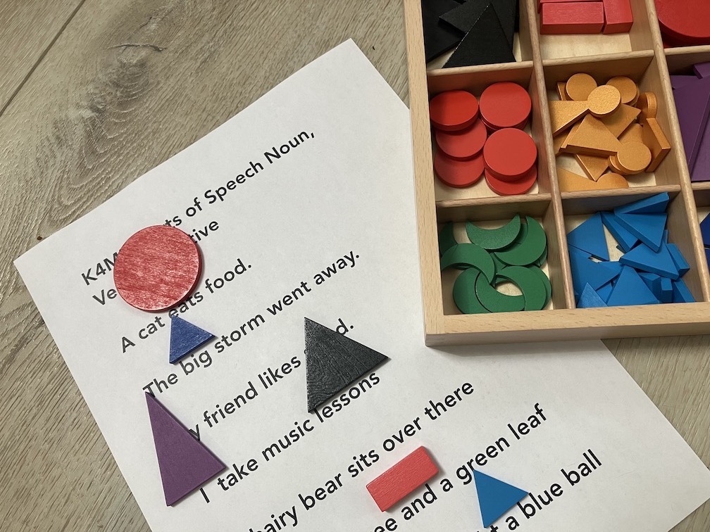 Our curriculum is Montessori based, using hands on materials when appropriate, and with books and worksheets for more abstract concepts. Our students, in Montessori fashion pull a job which matches the level they assessed at, and work it to the best of their ability, and if needed, a teacher introduces the job. When the job is complete, or when a student is having difficulty working their job, they turn on their "need a teacher light" on to indicate to a teacher that they need attention, and a teacher will come and sign off the job if complete, or help the student through the job as needed.